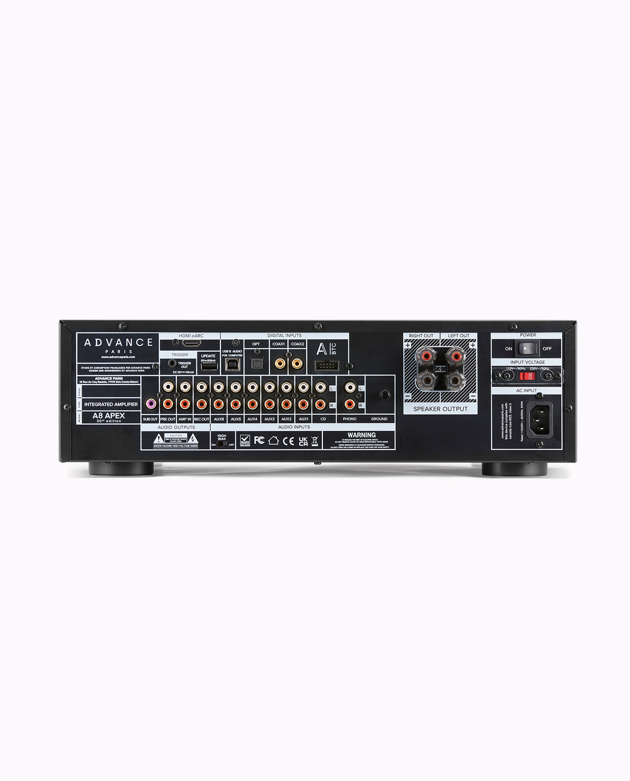 A8 APEX je hybridní integrovaný zesilovač inspirovaný modely A10 a A12, který kombinuje elektronky ECC81/12AT7 a tranzistory pro výkon 2×75 W ve třídě A/B. Nabízí vstupy pro různé zdroje (analogové, digitální, USB, HDMI e-ARC) a pokročilé funkce (1 výstup pro subwoofer, Pre-Out, Amp-In).